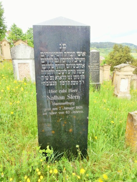 Gravestone of Nathan Stern in the Jewish cemetery of Pfaffenhausen nearby Hammelburg Nathan passed away on January 7, 1928 at the age of 63. His wife and widow Rosa Stern took over the business together with her second born daughter Bettina and her son-in-law Julius Mantel.