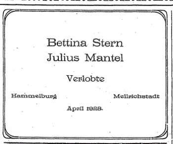 Bettina Stern (* 1901) married the merchant Julius Mantel in 1928. He was born in Mellrichstadt. In 1935 Julius Mantel chaired the Jewish Community of Hammelburg. In November 1938 he was arrested and deported to the concentration camp of Dachau.