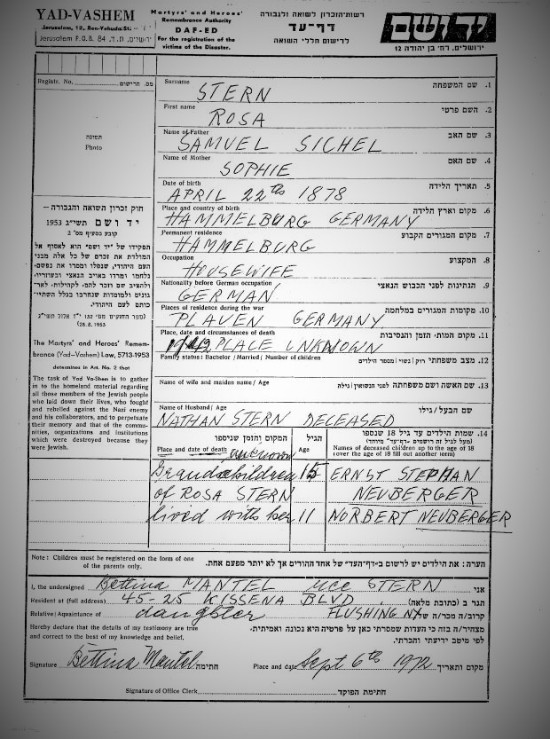 In 1939 the Stern Family was expelled by the Nazis from her hometown. Bettina and Julius Mantel left Hammelburg on January 13,1939. Rosa Stern and her first born daughter Frieda Neuberger went away on January 28, 1939. Reference: Stadtarchiv Hammelburg, Karl Stöckner Victims of Holocaust - The Stern Famliy - Hammelburg The two young sons of Frieda - Norbert Neuberger and Ernst Stefan Neuberger - remained in Germany with her grandmother Rosa Stern. The two boys visited a Jewish school and boarding home in Fürth. Together with her grandmother they were deported on May 1942 to Belzec and Sobibor. Their father - Heinz Neuberger - was murdered in 1937 by the Gestapo Mannheim. Norbert Neuberger